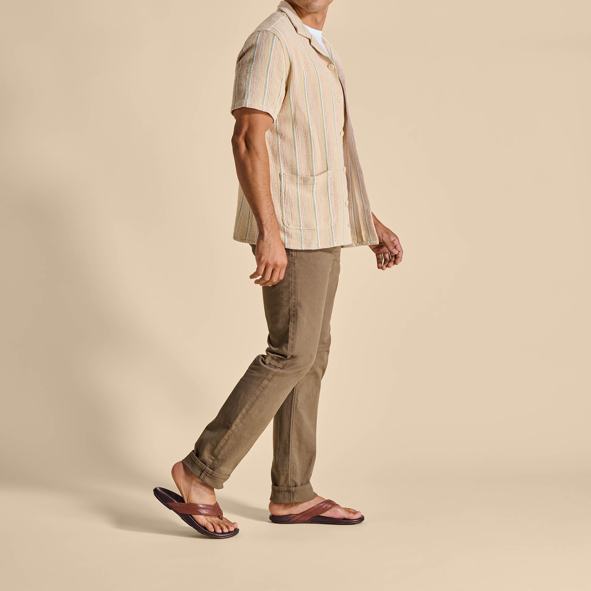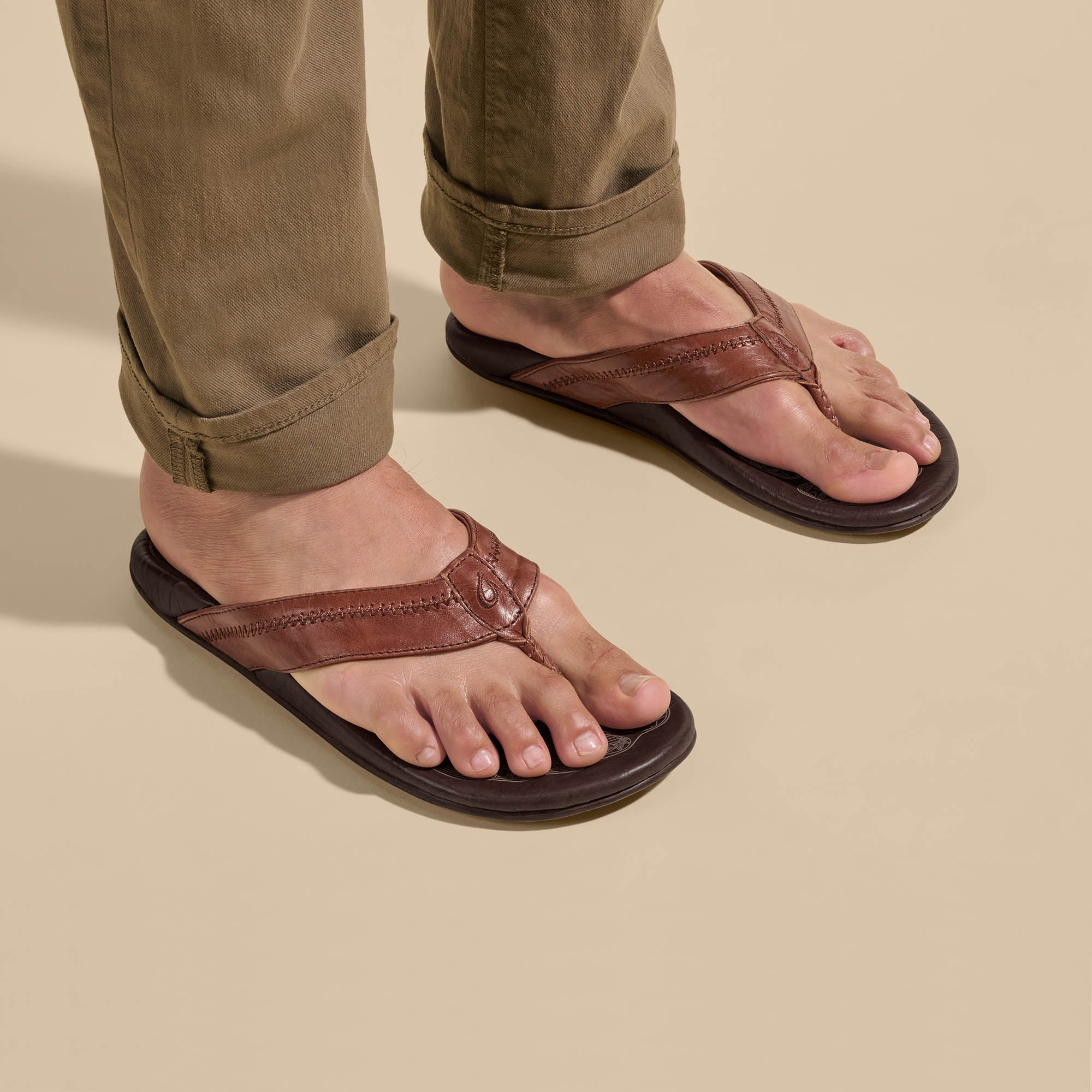What sets an OluKai sandal apart? We believe it's the blend of tradition. craftsmanship. and meticulous attention to detail. The Hiapo. one of our original sandals. is expertly constructed from naturally tumbled or marbled full-grain leather. It features handsewn traditional whipstitching and is decorated with Polynesian tattoo artwork on the footbed. With each wear. the Hiapo becomes even more distinguished. While it's perfect for beach outings. it is best kept away from prolonged contact with water to preserve its quality.