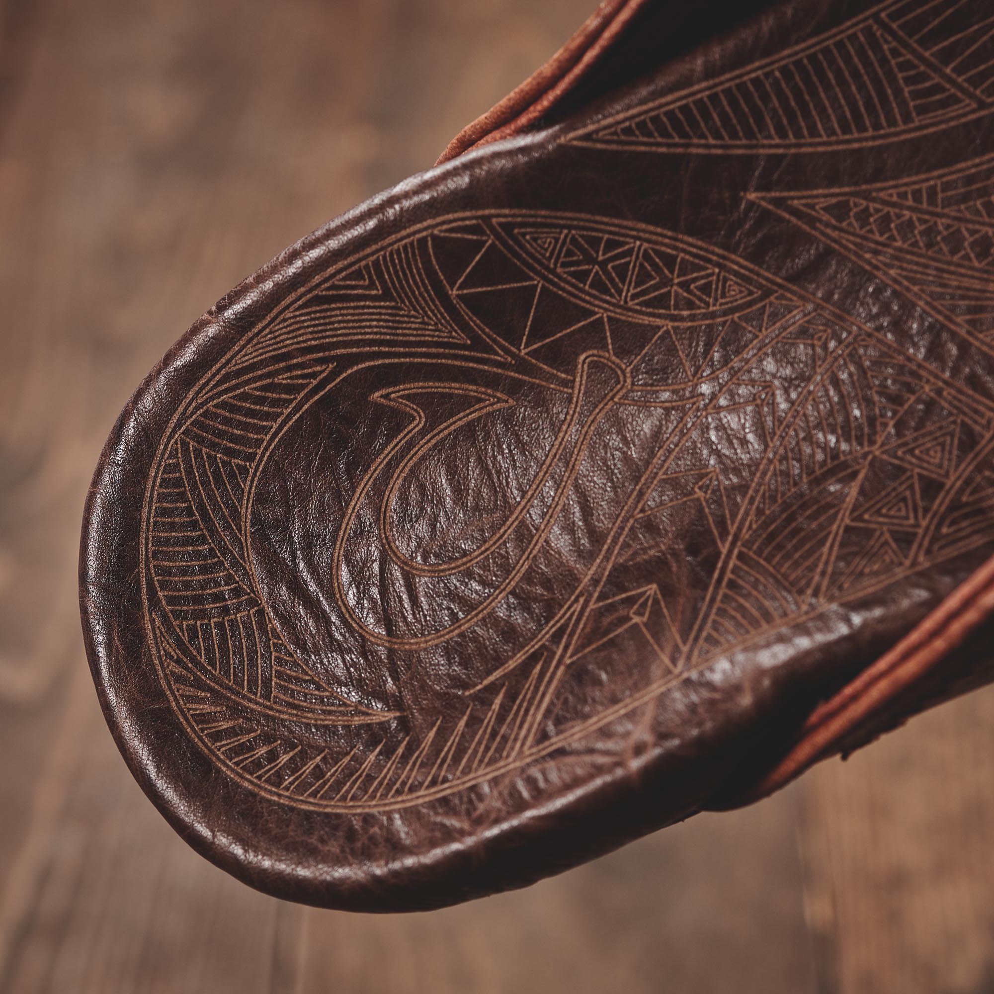OluKai Craftsmanship: Features handsewn traditional whipstitching and moko tattoo artwork on the footbed. showcasing unique cultural artistry.