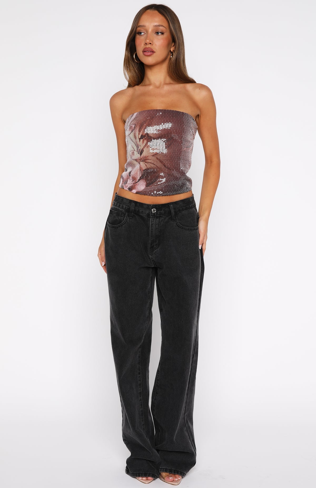 Enter every room with confidence in the Make It Real Strapless Sequin Bustier in Floral Shadows. This fully lined bustier brings the drama with sequin fabrication that catches the light. a strapless design supported by grip tape. and a secure back zipper with clasp closure. Pair with low-rise jeans and kitten heels for a playful combo that promises all eyes on you.