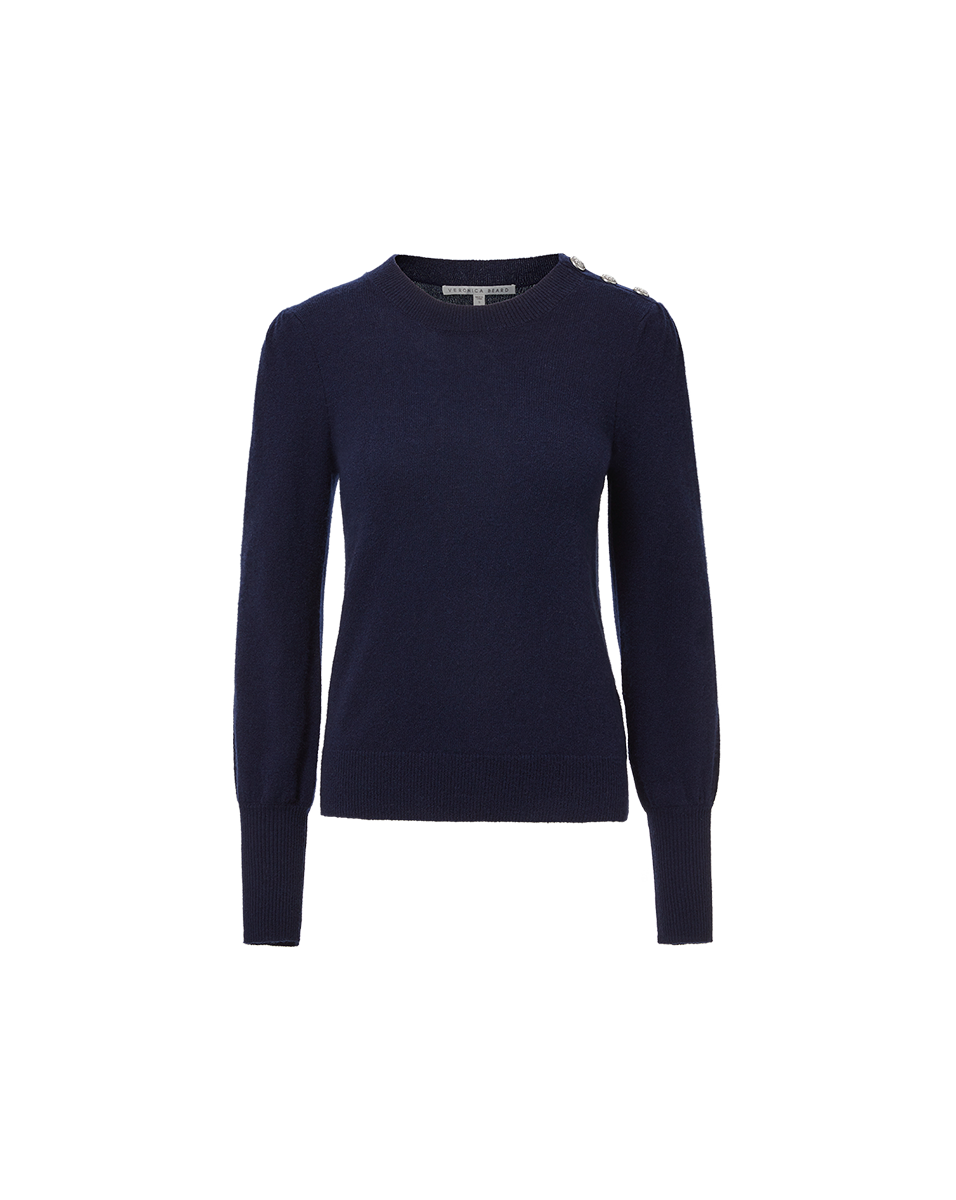 Spun from 100% luxury cashmere and updated with our signature crest buttons at the shoulder. the Nelia crew-neck sweater is a foundational wardrobe piece. Featuring a relaxed fit and subtly puffed shoulders. this lightweight knit is a classic you will reach for season after season. year after year. Wear with anything and everything—it's endlessly versatile. and exceptionally soft.