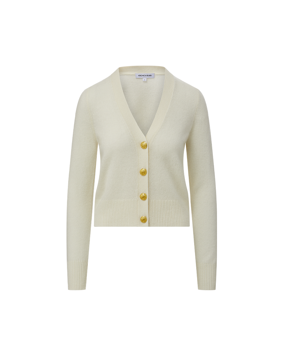 The seasonless. luxurious staple every woman needs. A classic cardigan is the cornerstone of any chic wardrobe. and. in 100% sumptuous cashmere with an exceptionally soft handle. the Solene is the ultimate. Slim-fitting with long sleeves. this off-white sweater is finished with a V-neckline and our signature crest buttons. Keep one on the back of your office chair—this classic works with any look.