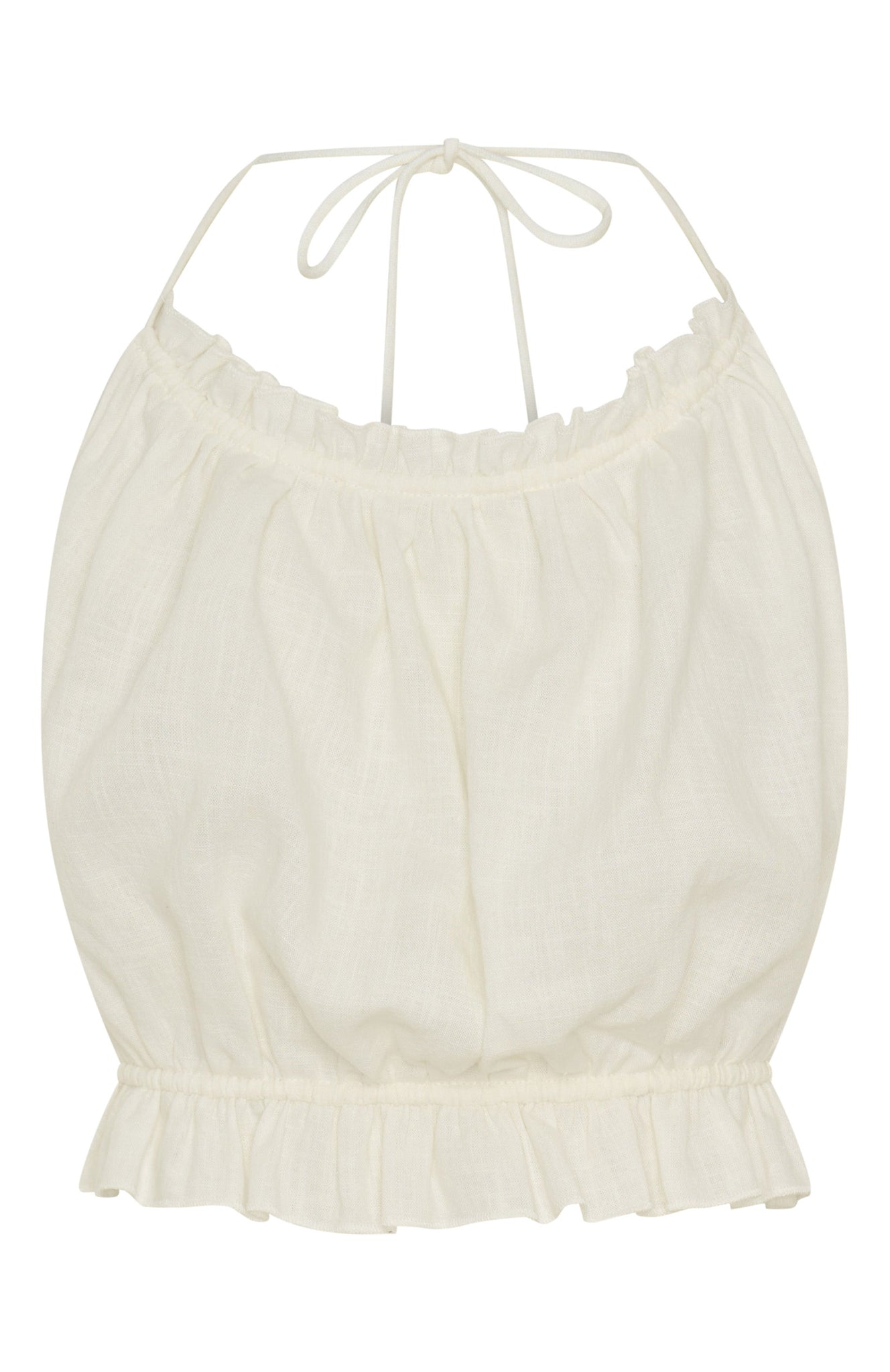 Statement separates that are even dreamier paired together. The Take Me Away Top in White features halter neckline with drawstring. ruffle detailing. drawstring straps on back to give support and backless. Complete the look with the matching Take Me Away Pant in White.