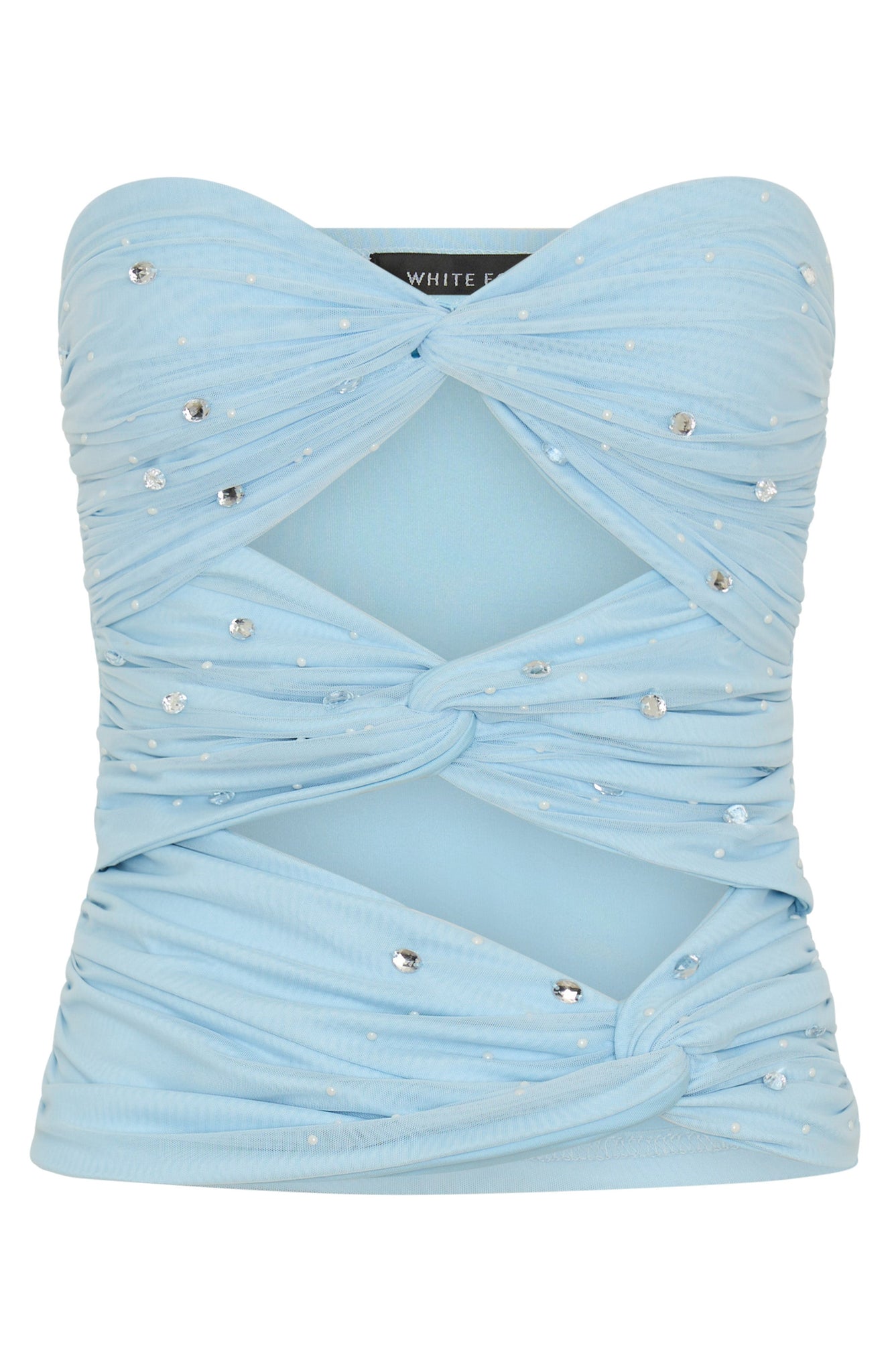 The Taking What's Mine Strapless Top in Blue all about the details. Features strapless neckline. grip tape. ruched knotted fabrication centre front with cut outs and stunning pearl and crystal detailing.