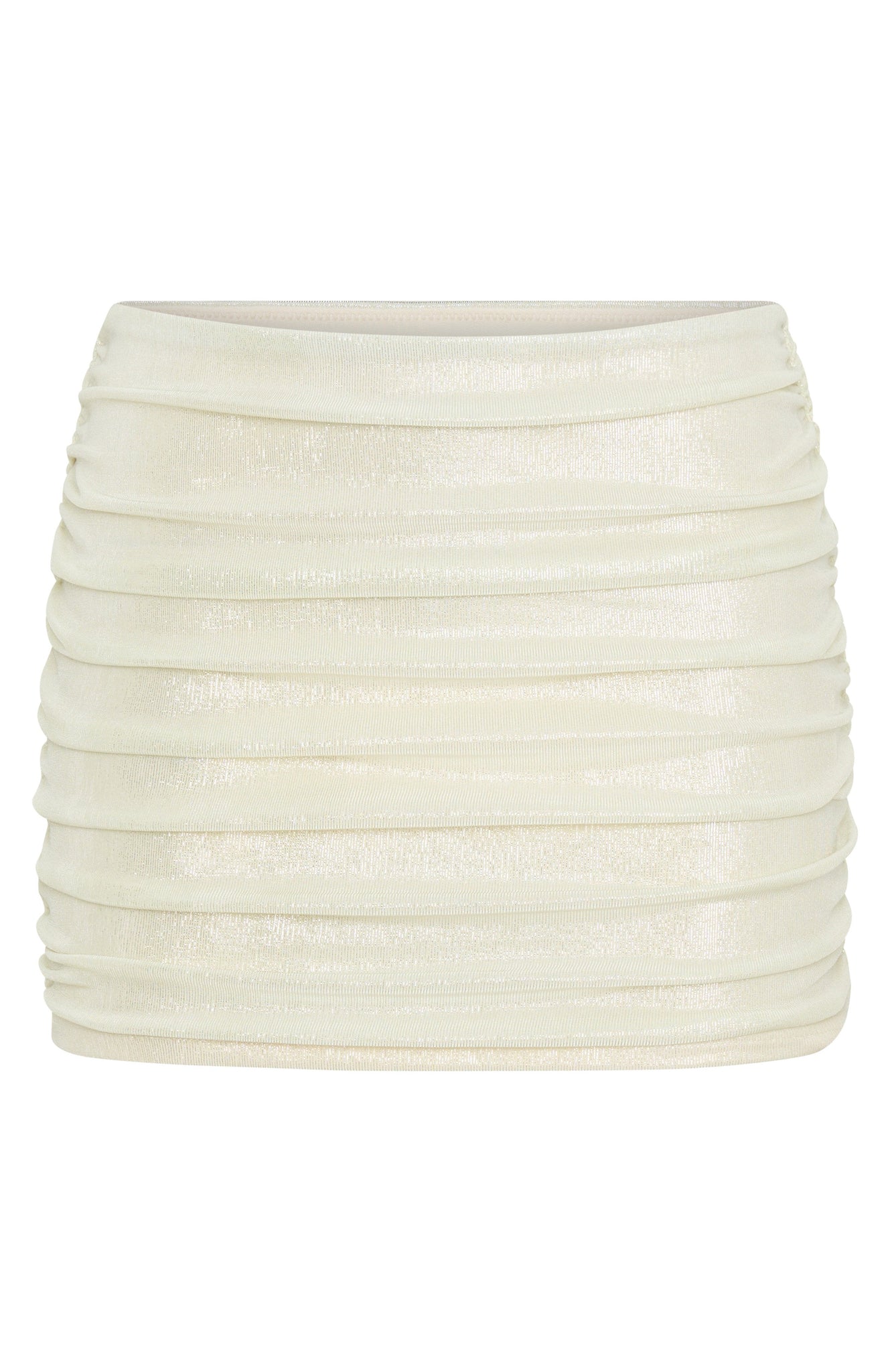 A vacation must-have. the Valencia Vibes Mini Skirt in Pearl! Features ruched side detailing. lined stretchy fabrication for an easy slip on and off design. Complete the look with the matching Valencia Vibes Top in Pearl for a look we love.